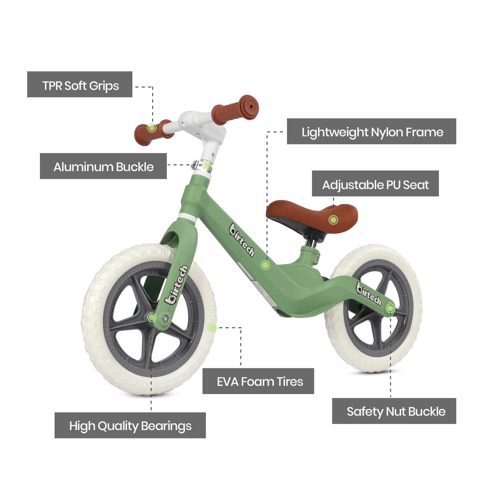 - Eco-Friendly and Safe: Made with non-toxic, SGS-certified materials. EVA solid tires and a soft shock-absorbing seat support up to 30kg for a comfy, safe ride.