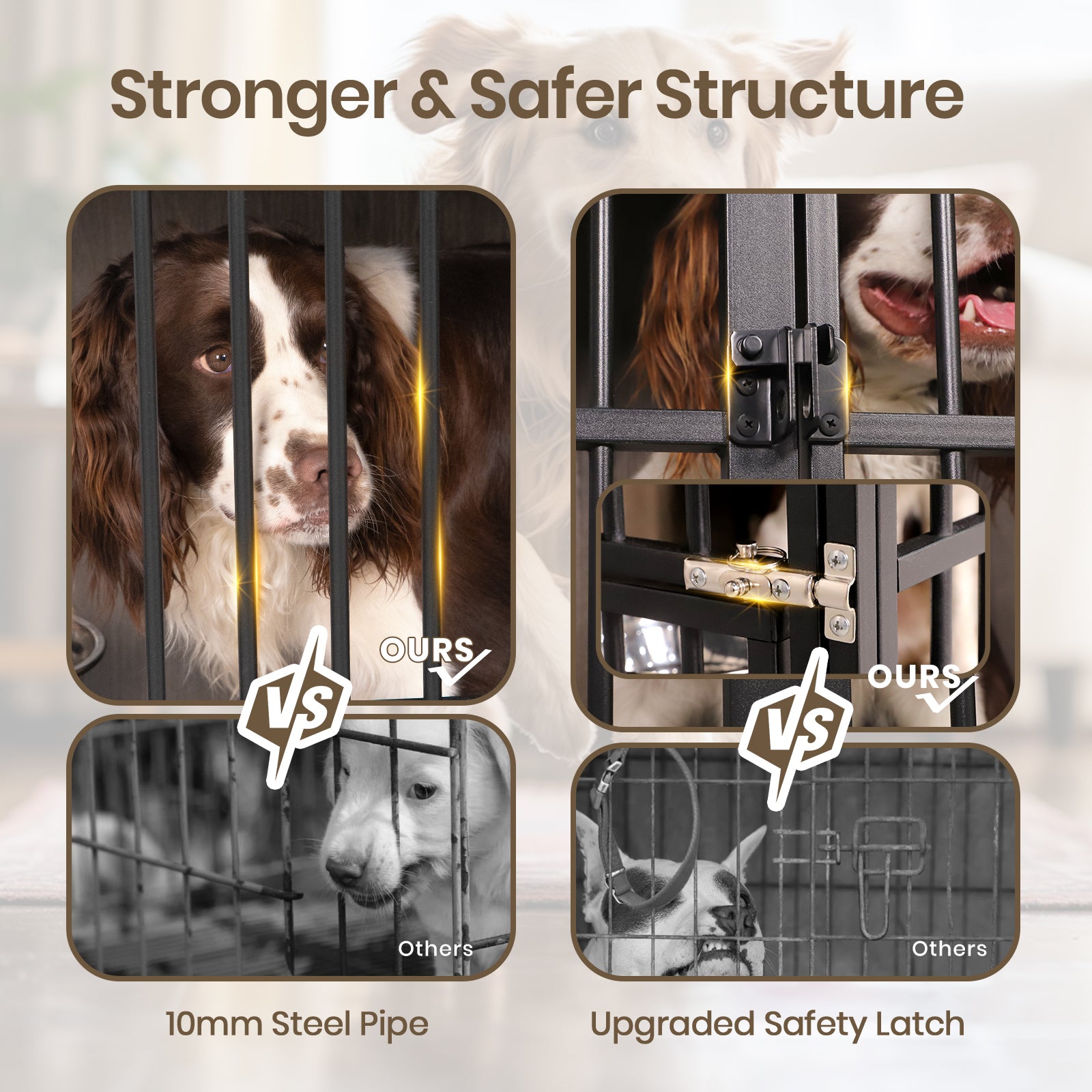 - Sturdy Build with Safety at Its Core: Crafted with reinforced steel pipes and thickened panels,this dog crate furniture delivers excellent strength and chew resistance — perfect for energetic pets.The dual-access design,with both front and side doors,makes it easy for your dog to come and go, while secure locks on both doors help keep your furry companion safe and secure,even when you're not at home.